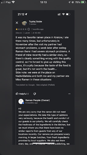 In return, the personnel of Ramen People just gaslights people saying they are putting so much effort in product quality that what people say is impossible and they might have eaten something else elsewhere… Since when such behavior is acceptable or even legal?...