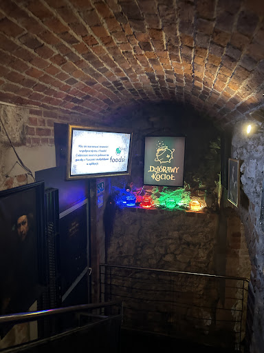 Read moreA fun quirky Harry Potter themed cafe under the Old Town. Everything is slightly different enough from the films. The props, like house flags, aren't exactly the same and there's no official images of actors from the films. Instead they're drawings. This I assume is to get around copyright issues but adds a lot of homemade charm to the experience. The tunnels the cafe is in are a great setting for the theme and are full of Harry Potter references which is fun. They are have boardgames which a lot of people seemed to be playing. There's a lot a small shop selling merchandise that is officially branded and cute. The menu is also all Harry Potter themed which was cute but the quality and vegetarian options were a bit lacking. Pumpkin periogi were the only vegetarian food item which I had and they were able to make my partner a sandwich with the meat taken out so it was be vegetarian which was kind and they were mainly premade. The food was okay but definitely not the best we had on Krakow. The drinks I had a chai latte which turned out to be a coffee latte with added cinnamon. The highlight was the bubbling potion drinks though! They were really fun and delicious and really looked like potions. I would go back and just have that and...