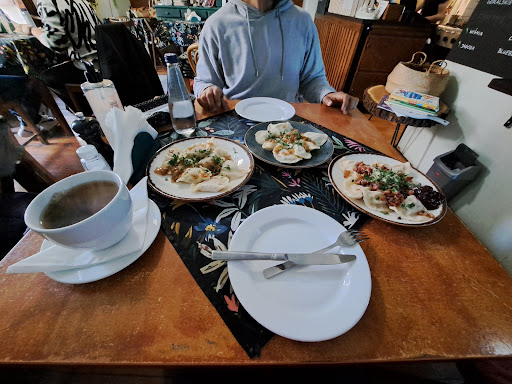 Comida: el menú básicamente consta de pierogi y sopas. Queríamos probar sopa y no les quedaba. De dos platos que sirves, uno no tienes.. Bueno, no pasa nada. Pedimos dos platos de pierogi. Los de carne, bastante bien, los de espinacas, realmente sobresalientes. Siendo yo de tierra castellana, raramente prefiero verdura a carne... ya sabéis a que me refiero, pues aquí, los de espinacas los bordan. Por favor, no dejeis de probarlos si finalmente decidis comer aqui. El problema es que tras haber probado otros restaurantes, no se puede decir que los pierogi fueran los mejores, y sin embargo, si que fueron los mas caros. Esto, para ser justos con el resto de sitios, no puede ser de 5 estrellas. Sin tener en cuenta este detalle del precio, sí que son recomendables.
