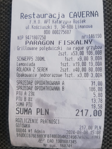 Read moreRestauracja Cavnerna w Limanowej to miejsce o przestronnym, schludnym wnętrzu, choć bez wyraźnie określonego motywu przewodniego, co może wpływać na brak spójnej atmosfery. Dla rodzin z dziećmi jest to jednak atrakcyjny wybór, dzięki dobrze wyposażonemu kącikowi zabaw, który zapewnia rozrywkę dla najmłodszych. Obsługa jest sympatyczna, a serwis sprawny, co sprawia, że dania trafiają na stół szybko.