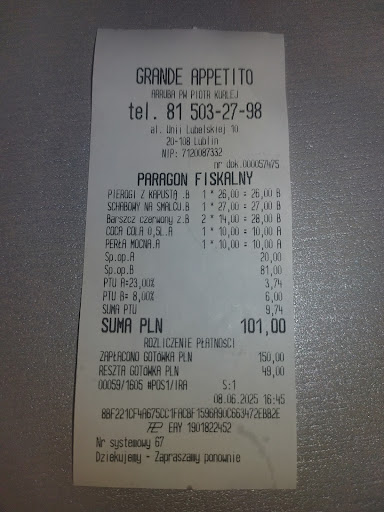 Read moreNie polecam. Czas oczekiwania dostawy (sniadanie) 2 godziny. Zamówienia przyjechały niezgodne z tym co na paragonie. Zamówione dwa takie same zestawu śniadaniowe z czego w jednym była dodatkowa wędlina, A w drugim nie. Dodatkowo na zamówieniu były nabite 2 tosty z serem i szynką które nie zostały dowiezione z całym zamówieniem, po konsultacji kierowcy z knajpą kierowca po prostu odjechał nie mówiąc co ustalił, zatem sama musiałam dzwonić do grande appetito po czym Pani mi w słuchawce powiedziała mi że myślała że kierowca że mną wszystko ustalił, A ona kazała mu jechać do następnego zamówienia. Dostałam informację że w przeciągu Pół gidziny-godziny przyjedzie inny kierowca i dostarczy nam nasze zamówione tosty (z szynką i sere). Sami zobaczcie co zostało nam dostarczone(zdjęcie ponizej) za 4.50zl. Gdzie za tą cenę kupię cały chleb tostowy w sklepie ;) Ogólnie nie polecam, tym bardziej że takie pomyłki nie zdazyly się...