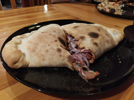 Read moreZamówienie złożone zostało przy barze. Pani obsługująca od razu poinformowała o czasie oczekiwania na pizze 30 min (dwa inne stoliki były zajęte przed nami). Zamówiliśmy Calzone oraz pizze ... Czas oczekiwania taki jak było wspominane. Calzone potężne, większe niż pizza pomimo podania na tym samym talerzu. Ciasto miękkie, puszyste, dobrze wypieczone złote na bokach, przypieczone na górze, delicje. Sos pomidorowy znajdujący się wewnątrz, swojski, obłędny w smaku. Wypełnieniem ciasta były min dobrej jakości szynki, czerwona cebula, pieczarki (mogę coś jeszcze pominąć). Ogólnie majstersztyk. Pizza również pyszna ze sporymi kawałkami kurczaka. Ser w obydwu ciągnący się. Obsługa miła, zgadana co zobaczyć można na otwartej kuchni połączonej z salą. Byliśmy świadkami przygotowania wspaniałego ciasta. Cieszylibyśmy się jednak by bardziej przykładali się do sprzątania stołów, nie jedynie na zebraniu talerzy. Mieliśmy nie mało pozostałości po poprzednich gościach typu mięso oraz paprochy. Dodatkowo minusem są tępe noże oraz talerze po kilku przejściach ślizgające się na stole przy próbie krojenia ciasta tępym nożem. Choć wystarczyłyby nawet jakieś maty by móc skupić się na nadzwyczajnym smaku zamiast krojeniu. Toaleta dość zadbana, znajduję się w niej również stelaż do...