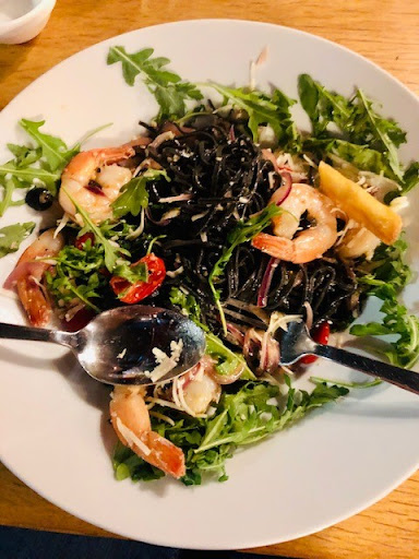 I really enjoyed my "pasta" - tagliatellini made with sepia served with big and tasty prawns.