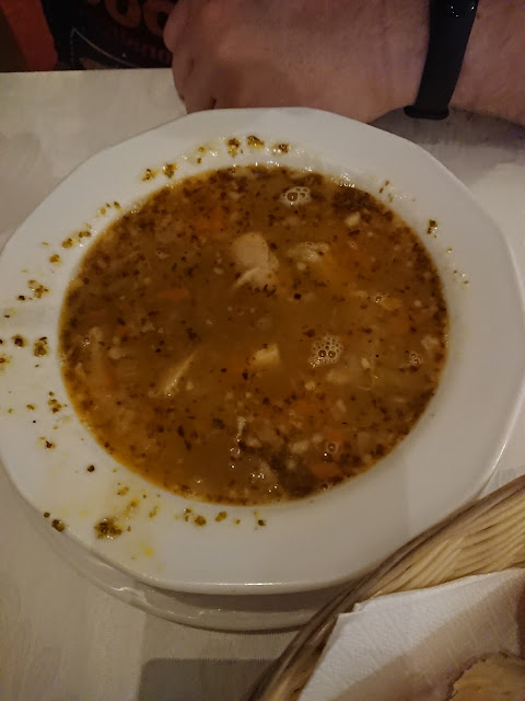 Powiem Wam szczerze, że nie spodziewałem się jeszcze kiedyś wejść do restauracji w takim stylu, jednak nazwa do czegoś zobowiązuje. Jest środek listopada a na dworzu pizga złem i choć wchodząc do Staromiejskiej od razu czuję się fizyczne ciepło to wnętrze jest tak jakby chłodne. Zachęceni cenami wraz z kolegą wchodzimy, mnóstwo wolnego miejsca. Zajmujemy dowolnie wybrany stolik i zaraz za chwilę pojawia się miła Pani kelnerka. Przyszliśmy tylko na pierogi, jednak nie mogłem odpuścić sobie kremowej zupy z dyni. Za chwilę zupa wjechała na stół. Rany, w tak krótkim czasie nie dostaniesz nawet kawy w MC. Była smaczna choć na mój gust powinna być nieco bardziej pikantna. Smakując zrozumiałem już po co został przyniesiony nam do stolika przyprawnik, ale imbiru tam nie było cholera! Chwilę później na stół wjeżdżają dwa talerze pięknie ulepionych i okraszonych boczkiem pierogów. Moje ruskie były poprawne, jednak tak smacznych kapuścianych dawno nie jadłem. Where is toaleta, hehe Tak już mam że nawet jak mi się nie chce to zawsze idę bo kiedyś w jednej restauracji w Elblągu podłoga w toalecie wyłożona była piękną mozaiką i tak chodzę po tych kiblach i szukam czegoś co może mnie podobnie zachwycić. Gdyby nie ten wszędobylski chłód było by 5, jedzenie smaczne, czysto, jednak brak mi w tej...