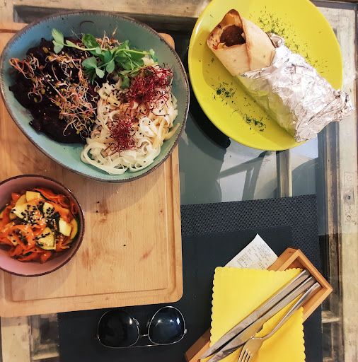 Read moreWpadliśmy z kumplem z racji dobrych opini. Zamówiłam talerz azjatycki w cenie 30 złotych i dostałam naprawdę dużą, fajną porcję składającą się z makaronu ryżowego [idealnie ugotowany], surówki na bazie oleju sezamowego z marchewką i cukinią oraz prawdziwy majstersztyk w postaci potrawki buraczano-bakłażanowo-szpinakowej, która była po prostu rewelacyjna! Osoba towarzysząca zamówiła falafelka w cieście tortilla - aż 7 kawałków "kotleta" było miłym zaskoczeniem, jednak zgodnie z tym co mówił poprawiłby stopień wypieczenia ciasta [zrobiło się ciaprate] i dodałby inny sos, bo ketchup nie pasował do tego dania - lepszy byłby sos majonezowy lub śmietanowy. Jako, że oceniamy wspólnie to 4/5 gwiazdek za jedzenie. Co do wystroju - minusem miejsca jest na pewno jego lokalizacja. Owszem, jest na uboczu, są krzesła na dworze, ale widok odrapanych kamienic i zaśmieconego podwórka naprzeciwko, nie jest niczym miłym. W środku schludnie, meble "każde z innej parafii", ale przyznam szczerze, że bardzo spodobał mi się akcent w postaci obrazów wyszywanych, których zdjęcie zamieszczam. Toalety czyste. Podsumowując, dla kuchni warto iść - moje danie było bardzo smaczne. Pomimo pierwszego, nienajlepszego wrażenia jakie sprawia lokal wizualnie, smaki kryją się w...