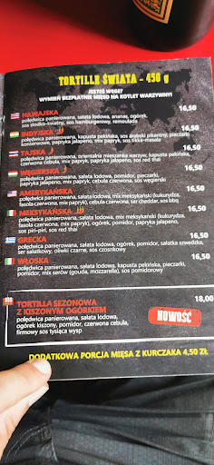 Read moreTortilla tajska (16,50 zł) - orientalna mieszanka warzyw, kapusta pekińska, czerwona cebula, mix papryk, jalapeno, sos red thai. Bardzo smaczna, nawet nieźle wyczuwalna ostrość, chrupiące warzywa, dobry sos. W zasadzie nie ma się do czego przyczepić.