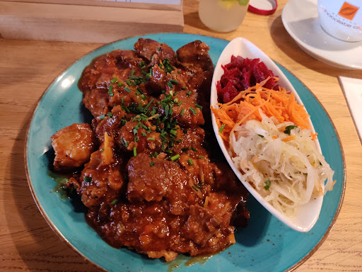 Jedzenie jest smaczne, aczkolwiek mogłoby być bardziej. Sos w placku po węgiersku jest za słodki i lekko przesolony. System obsługi klienta może wprowadzić niejednego w zakłopotanie. Niby jednak jest obsługa kelnerska, ale zamówienia są składane przy ladzie i od razu opłacane. Poza tym dania są łanie podawane, czas oczekiwania jest bardzo krótki, a wnętrze jest zadbane. Jedzenie jest dobre, ale w niczym nie zachwyca. Szkoda, bo lokal ma potencjał, a wystarczyłyby niewielkie zmiany by stać się dobrze prosperującą restauracją. Jeszcze jedna mała uwaga🙂. Wyłącznik światła w łazience jest przed wejściem przy pierwszych drzwiach. Ciężko go dostrzec w takim miejscu przy pierwszym użytkowaniu. English: The food is tasty, although it could be more. The sauce in the Hungarian pancake is too sweet and slightly salted. The customer service system can confuse many people. Apparently there is waiter service, but orders are placed at the counter and paid for immediately. In addition, the dishes are served, waiting times are very short and the interior is well-kept. The food is good but nothing special. It is a pity, because the restaurant has potential, and it would take only a few changes to become a thriving restaurant. One more little note. The bathroom light switch is in front of the entrance, by the first door. It's hard to see it in such a place the first...