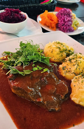 Cóż tu dużo mówić - bardzo dobre jedzenie w rozsądnych cenach. Byłem w "Misiu" podczas trwania konwentu Pilkon 2025 i bardzo pozytywnie mnie zaskoczył. Po pierwsze bardzo fajnie, że mają po dwa rozmiary porcji do większości dań - jest to świetna opcja na mniejszy głód. Zamówiłem mały (250ml) żurek i duży placek po węgiersku. Zupa była gęsta, aromatyczna, z dużą ilością kiełbasy (zwykłej i białej), że sporą iloscią jajka - nie szczędzono tutaj przypraw. Stanowczo mogę powiedzieć, że był to jeden z najlepszych żurków, jaki jadłem w knajpie. Natomiast placek po węgiersku to jakieś monstrum - myślę, że śmialo można powiedzieć, że porcja ważyła dobre pół kilograma. Placek dosyć gruby, z dobrych ziemniaków, był dobrze wysmażony, zdecydowanie syty i po prostu sam w sobie bardzo smaczny, a aromatyczny gulasz z bardzo kruchym i dobrze doprawionym mięsem dopełnił dzieła. A dodatek kwaśnej śmietany i sera dopełnił smaku. Zdecydowanym plusem było to, że do placka dodano talerz trzech różnych surówek - wszystkie świeże i bardzo smaczne - jest to coś, czego wcale nie tak często uświadczymy zamawiając placek po węgiersku. Ogólnie wszystko było bardzo smaczne, a stosunek jakości i wielkości porcji do ceny wypada naprawdę bardzo korzystnie. Obsługa miła, przyjazna i profesjonalna, ale sporo czasu minęło, nim dostałem zamówienie - zrzucam to na karb trwającego nieopodal konwentu (kilka tysięcy głodnych ludzi na niewielkim obszarze ma prawo spowolnić wydawkę 😉) Klimat lokalu również bardzo na plus - bardzo lubię film "Miś", więc wystrój zawierający kadry z filmu zdecydowanie przypadł mi do gustu. Poza tym w lokalu było schludnie i czysto, a czas umilała muzyka w postaci polskich klasyków. Zdecydowanie jest to lokal, który trzeba koniecznie odwiedzić...