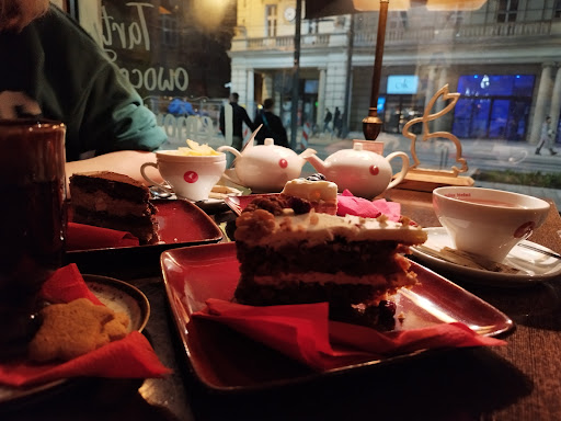 Read moreMiejsce w centrum Poznania Lokal mały, ciasny, duży hałas, kelnerki noszące tace z gorącymi napojami ponad głowami gości siedzących przy stolikach, chaotyczne, gubiące się co komu podać ( zamówienia składa się przy barze i później problem gdzie zanieść zamówienie). Mieliśmy rezerwację na 14 osób, po przyjściu okazało się, że miejsc jest dla osób 8 ( 3 złączone stoliki), na których nie mieściły się zamówione desery. Kawa , o którą trzeba było się upominać, bo nasza trafiła podobno do innych gości, została podana po zjedzonym cieście. Ciasto było przynoszone w odstępach 5-10 min dla kolejnych osób przy stoliku. Nie było żadnej organizacji i panowanie ze strony personelu nad tym co dzieje się w lokalu. Złożyliśmy zamówienie, a goście, którzy przyszli później zdążyli już wypić swoją kawę i wyjść, a my jeszcze nie doczekaliśmy się realizacji całego zamówienia. Chaos, brak organizacji pracy i jakiejkolwiek wiedzy na temat ergonomii stanowiska pracy. Wniosek nasuwa się taki, że jeżeli nie ma możliwości lub umiejętności obsłużenia grupy 14 osób, to nie należało przyjmować rezerwacji. (zgłaszanej w lokalu, nie internetowo) Faktem jest, że desery i ciasta świeże i pyszne, porcje duże, kawa też b. dobra. Niestety miejsce zupełnie nie nadające się na rodzinny wypad do kawiarni. Może dla pary wciśniętej w kąt pomiędzy parami przy sąsiednich stolikach. Jest jesień, a nie ma wieszaków, nie ma gdzie odwiesić mokrego płaszcza, kurtki. I jeszcze jedno, zakurzone dekoracje w ilości max w przejściu do toalety nie są najlepszą wizytówką lokalu. Ponadto czekając na wejście do niej goście nie muszą oglądać całego procesu przygotowywania zamówień. Pomimo pyszności, nie wrócę tu. Nie można odpocząć w takim zgiełku i chaosie. Może należałoby zlikwidować stoliki stojące pośrodku lokalu i przeszkolić załogę- miłą, ale nie...