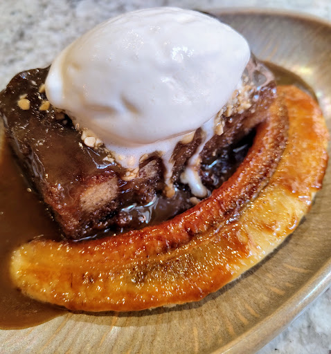 Whenever one is in Poland, trying the duck is a must, especially bearing in mind that the Polish are excellent at preparing it. So it was no wonder that the duck leg I ordered at "Mo.Bar" was tender and melting in my mouth. The duck leg came with homemade dumplings, cabbage with pistachios and ratatouille jam. Everything was just in its place and there was a nice hint of various tastes and textures. The cabbage was excellent, bearing in mind, that cabbage can be easily overcooked and this one was exactly as it should have been. The crunchiness of Pistachios was a very nice little touch and the edible flowers and micro-herbs united the whole dish. But what surprised me most was "Sticky Toffee Pudding" which is my personal favourite among the desserts and I can proudly say that the Sticky Toffee Pudding they serve at "Mo.Bar" is one of the best I have ever tried. The gorgeous, rich and delightful sticky toffee pudding with homemade sticky toffee sauce and served with ice cream is an ultimate delight, but the ideally caramelised banana which came with this one added another level to this dessert. The vanilla ice-cream was neutralise the sweetness of the sponge cake and the toffee and the banana and it is one of the desserts for which I will definitely go back to Poznan !
