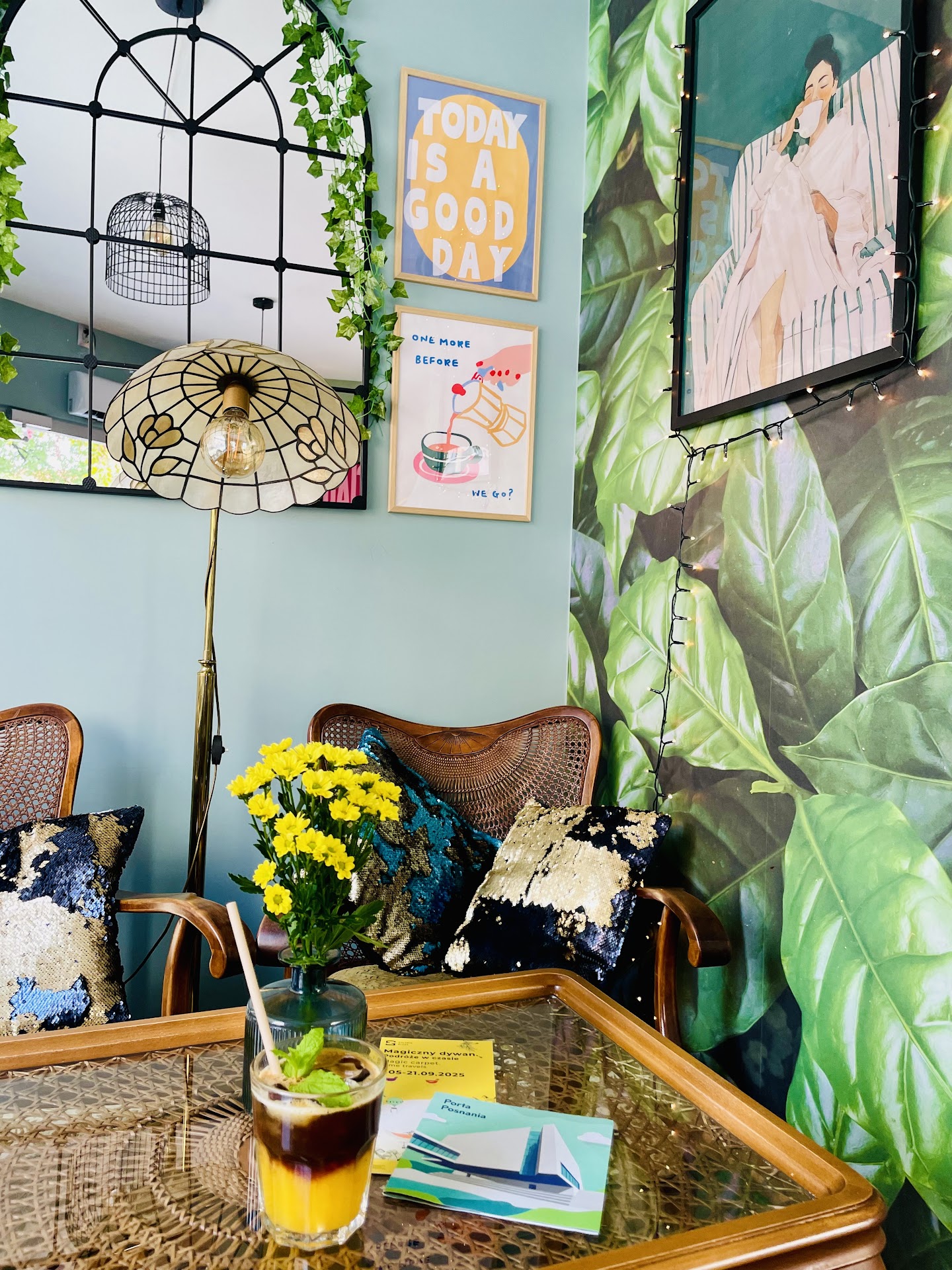 Wnętrze urzeka spójnością i dbałością o detale: pastelowe ściany w zielonych odcieniach, ręcznie rysowane murale, duże okna z widokiem na tętniący życiem deptak, a także subtelne dekoracje – od świeżych kwiatów na stolikach, po klimatyczne plakaty i lampy, które nadają przestrzeni lekkości i ciepła. Atmosfera jest równocześnie swobodna i elegancka – idealna na krótką przerwę w ciągu dnia lub spotkanie w towarzystwie.