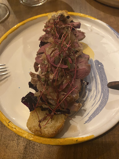 Read moreObsługa fatalna!!! Jako grupa 15 osób mieliśmy zrobioną rezerwację przynajmniej z dwa tygodnie wcześniej (chyba nawet więcej). Zapytano nas przed co wybieramy z menu. Każdy wskazał co chciałby zjeść. W związku z obchodzonymi uroczystościami Dnia Niepodległości w menu pojawiła się także gęsina. I to chyba mocno znienacka, bowiem zostaliśmy o tym poinformowani jakieś 22 godziny przed wizytą. Niektórzy skusili się na gęsinę (między innymi ja), o czym poinformowaliśmy lokal. I teraz meritum. Rezerwacja była na godzinę 16.00. Już zacierałam ręce, a po drodze do lokalu za mną ciągnęły się pokłady mojej śliny na myśl o tym, że już czeka na nas cieplutkie pyszne jedzonko. O losie przewrotny! Weszliśmy, usiedliśmy, obsługa zapytała nas o wybór napojów. Jedzonka nie ma. Zamówiliśmy drinki. Czekamy. Drinki zostały przyniesione po 35 minutach. Jedzonka nie ma. Sączymy sobie drineczki. Jedzonka nie ma. Siorbiemy lód z drinków. Minęło 60 minut. Jedzonka nie ma. Jest 17.00. Jedzonka nie ma. Pobiegli po gęsinę jak nic. Na fermę. Do sąsiedniego województwa. Po 80 minutach wjechał rosół z gęsi. Czyli się udało. Złapali gąski. Rosół dobry. Znów czekamy na drugie dania. Po jakimś czasie się udało. Gęsina zrobiona momentami dobrze, momentami guma. Ale absolutnym hitem, taką wisienką na torcie był fakt, że do rachunku doliczono nam 9 zł (od osoby) za obsługę! Czyli 135 zł łącznie za to, że ktoś RACZYŁ nas obsłużyć i złapać dla nas gęsinę w jedyne 80 minut naszego czekania. Także uczucia mam bardzo mieszane. Lokal polecany dla osób nudzących się w życiu i mało głodnych, bądź też dla takich, którym obojętne czy zjedzą śniadanie na obiad, obiad na kolację lub kolację na śniadanie. Ja osobiście czuje się zażenowana wizytą w tym miejscu i na pewno więcej tam nie wrócę, chyba, że będę chciała uciąć sobie półtoragodzinną drzemkę przed jedzeniem. Dołączam zdjęcie foccaci z gęsiną...
