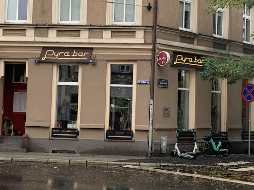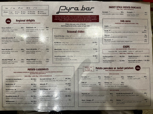 Restaurant decor is simple, like in bistro. The place is small but there are a lot of tables inside and outside in the beer garden. The menu has a huge amount of different potatoes dishes. Variety of food made from potatoes is dazzling. I was absolutely shocked. Although everything is made of potatoes, the menu is not boring. Prices are affordable, you can go there with whole your family, and what is more, you can find something good and delectable for everyone, of all ages. Funny names of dishes, e.g. „dla małych pyrożerców”, „pyrażusie”, „pyrocząstki w ziołach”, „frytasy”, „pyranoja”, „kurczak Cukinsyn”. The food is well plated, looks appetizing. The plates refers to simplicity of dishes. I choose typical Poznań cuisine - pyry z gzikiem, that reminded me the taste from ma childhood. Very well baked potato with flavorful cottage cheese and herbs. In addition we also ordered potato pancakes, that was served in many ways with a lot of additions, for example with salmon or tuna! I didn’t eat but it must taste heady. We also took heap of fries, tasted gorgeous, like real potatoes. Great and interesting place for spending time and get to know Poznań, talk about the city, its history, local tradition and of course cuisine in which pyry (potatoes) play important role. For me personally, a nice meeting with the flavors that sometimes appeared in the family...