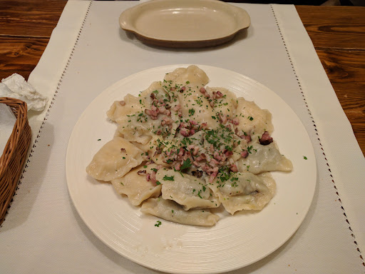 About the food. We were two and shared 2 soups: "Żur z kiełbasą, ziemniakiem oraz jajkiem w czarce chlebowej" (served in a bread) and "Grzybowa z domowymi łazankami". Both of them were delicious, even if I did like more the second soup. This, we shared a plate of 15 pierogi (polish dumplings), i.e. "Micha pierogowa (pierogi z mięsem, pierogi z kapustą, pierogi ruskie)". This dish was supposed to have 5 pierogi with meat, 5 with cabbage and 5 with a mix of cheese an onion. These were among the best boiled pierogi I had in Poland!