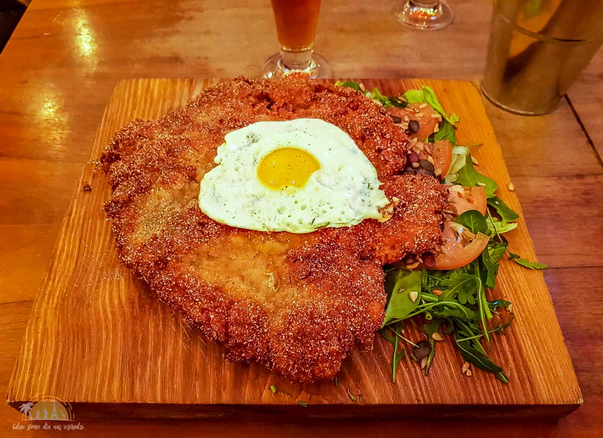 Idzie mój schab! Zazdrosne spojrzenia z innych stolików łypią na niego. Kasia zdziwiona pyta czy ja to zjem. Cóż to za pytanie, jak można wątpić w moje zdolności pochłaniania jedzenia.  Do rzeczy, schab, a bardziej schabisko podane na drewnianej desce z jajem sadzonym na wierzchu. Schab bardzo dobry, całkiem chudy, panierka nie za gruba, nie za cienka, lecz w sam raz  . Dopiero po chwili jedzenia dokopałem się do sałatki colesław i ziemniaków pieczonych, które były pod schabem. Poprawne, nie ma się do czego przyczepić. Fajnie, że do tego wszystkiego było jeszcze trochę świeżej zieleniny, dobre zbalansowanie takiej porcji cholesterolu.