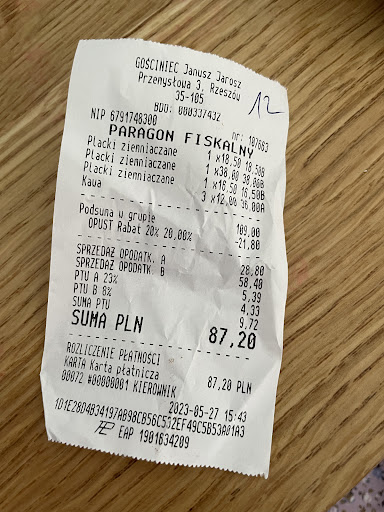 Read moreMy mother is Polish, my father Swiss. We live in Switzerland, but visit often Poland to see my mother's family. This time, we wanted to profit the utmost of traditional Polish food, so we decided to eat in the Rzeszow-Gosciniec as we already spent time in Rzeszow with a part of my mother's family. The people working in the restaurant were really kind and welcoming, the restaurant was decorated in a typical Polish manner, and the food was delicious and payable, even for a small budget. I highly recommend to eat there, if true Polish kitchen and atmosphere should be...