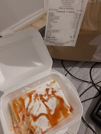 Dzień dobry, Niestety nie polecam Dobrej Kuchni po swoim ostatnim zamowieniu .. 6.11 zamówiłam dania przez pyszne.pl. Makaron z sosem bolońskim z chrząstkami!!!! Fuj, po znalezieniu pierwszej myślałam że może to przypadek, ale po drugiej danie do kosza. Ja rozumiem że to mielone mięso, ale można kupić dobre mięso mielone. Naleśniki- z dżemem truskawkowym i z kremem czekoladowym. Od zawsze są cienkie zarówno ciasto jak i nadzienie. Ale te były tak tłuste że w opakowaniu więcej pływało tłuszczu niż naleśników!!!! Do kosza. Filet w panierce z frytkami - filetu to nawet mój kot nie chciał zjeść, a on je dosłownie wszystko. Frytki - niedosmazone, wg mnie brakło z 10 minut smażenia. Z 4 dań zjadliwa była jedynie surowka z białej kapusty.
