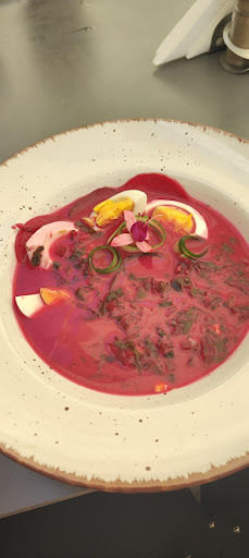 Read moreChłodnik, mimo że prezentował się naprawdę ładnie – miał ładny, intensywny kolor i był estetycznie podany – zupełnie nie spełnił oczekiwań smakowych. Zupa była mocno rozwodniona, praktycznie bez żadnych przypraw. W smaku kompletnie nijaka – brakowało soli, pieprzu, a koperek występował w ilościach symbolicznych. Szczypiorek? Nie było go wcale. Do tego buraki były bardzo twarde, jakby niedogotowane, co dodatkowo psuło odbiór całości. Całość oparta była na kefirze, ale nie zrównoważono go żadnymi dodatkami – efekt był niestety mdły i pozbawiony charakteru.