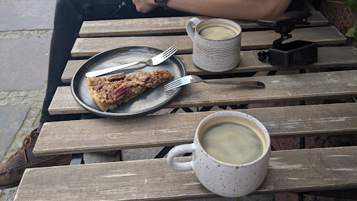 Nice cafe with great coffee and cakes. Got the pecan tart which was very well prepared. It's obviously a sugary treat, but I'm always looking for things that aren't overly sugary or sweet. The crust was buttery and the flavor of the nuts came through nicely rather than being drowned out by the flavor of sugar. Would definitely come back to try more as everything looked fresh and delightful. Loved the ceramic ware things were being served on, which seemed to also be...