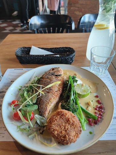 Ogólnie stan sali przywołuje na myśl hale żywieniową z galerii handlowej. Mnóstwo stolików nieposprzątanych po gościach którzy wyszli już chwile temu. Chusteczki, frytki, mąka(oby) czy resztki surówki na podłodze w sumie w całym lokalu. Zaproszono nas we dwie osoby do stolika dla 6 osób. Fajnie, że luźno ale chyba można dysponować zasobami lepiej. Stolik " przetarty" ale dalej tłusty i lepiący (po zgłoszeniu, zdziwieniu: "przecież było dopiero wytarte",wytarty ponownie i okej) ale z krzeseł okruchy nieposprzątane, owoce pod krzesłem i wspomniana mąka. No brudno. Tyle. Wyraźnie brak kierownika sali, który młodemu, bardzo sympatycznemu personelowi przypomni o schematach postępowania i obsługi klienta. Wiadomo, że lepiej pracować mniej niż więcej za to samo ale to rola szefa, żeby jednak było zrobione.i tyle. To wszystko obniża poziom " doświadczenia restauracyjnego". To nie byle garkuchnia a bardzo przyjemna restauracja, brak tylko kropki nad "i". Będę wracał,bo najważniejsza jest kuchnia. O tej nie będę pisał za dużo. Broni się sama i całego lokalu. Dania pyszne. Zaplanowane jako ciekawe i niebanalne połączenia. Świetnie wykonane. Ładnie podane. Porcja dobra, cena adekwatna do dania na talerzu. Nie polecam jedynie burgera. To nie miejsce na to. 3 próby i 3 wtopy. Nie każdy musi umieć wszystko. Pyszna cytrynowa lemoniada.
