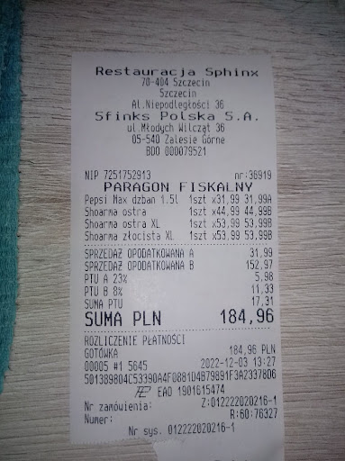 Read moreJestem totalnie rozczarowany. Na początku chcę podkreślić, że nie byłem tutaj już z 2 lata, ale kiedyś była to moja ulubiona knajpka, a sharme jadłem z 3 razy w tygodniu. Ceny i smak wygrywały wszystko. Dzisiaj była dyskusja co by zjeść, namówiłem rodzinę na Sfinxa. I szczerze, myślałem, że mnie znienawidzą a ja sam nie wiem co się stało... 2 gwiazdki tylko dlatego, że każdemu należy dać szansę, ale powinno być - 5... Zacznę od rzeczy drugorzędnych. Synek chciał siku, poszedłem z nim do toalety męskiej. Pisuar nie działa, muszla obsikana jak w jakiejś podrzędnej pijalni piwa, brak papieru, brak nawet ręczników papierowych. Ale jesteśmy facetami, damy radę. Dalej. kelnerzy, którzy zawsze tutaj byli pełni wigoru, doradzali, odradzali, byli Twoim towarzyszem podczas spaceru przez smaki, dziś byli smutni, nieobecni. Zero uśmiechu, zero doradzenia (ja akurat wiedziałem co chcę) , trochę jakby wrócili prosto z imprezy...Dwoje chyba ukraińców, totalnie nie czujących jak ważną rolę odgrywaja w restauracji. Trudno, może kolejna drobnostka, której się czepiam. Idziemy dalej. Spojrzeliśmy w menu, praktycznie każda potrawa nas wołała. Wzieliśmy różne, chociaż ceny nas zaskoczyly bo były bardzie z Radeckiego czy Orro a nie z sieciówki, ale co tam, jesteśmy mega głodni. Wybraliśmy. Domówiliśmy przystawkę, która z plakacików aż nas wołała. Grzanki czy jakoś tak z kurkami. I tutaj pierwsze rozczarowanie. Za 27 zł dostaliśmy... 2 malutkie kawałki bagietki, po 3 plasterki kurek i sos. Z początku myśleliśmy, że to żart, ale co tam. Jemy. Okazuje się, że zamiast dopiec kawałeczki bagietki, to były niedopieczone, jedliśmy po prostu małą mokrą bułkę z sosem i kawałkiem grzyba. Dobra, jesteśmy głodni. I tutaj kolejny hit. Czekamy i czekamy, dodam, że na zewnatrz z nami zajete byly 3 stoliki, w środku też 3, więc tłoczno nie było. Kiedyś przy pełnej sali danie dostawało się w 20 min max. Ale co tam. Czekamy 20 min, czekamy, 30 min, czekamy 40 min... w końcu Pani stolik obok zrobiła awanturę, i zaczeli przynosić dania. I tu się załamałem. Najpierw dostał syn, kurczaka w panierce. Spalony , i to bardzo, ale był głodny, powiedział, że zje (ja bym nie zjadł) , placki z jakimś sosem pomidorowym córka zjadła, mówiła, że ok, no i nasze różne sharmy + sosy.... płakać mi się chciało, jak można było tak zrujnować moje ulubione danie i knajpę! Mięso wołowe było tłuste jakby w oleju się całą noc kąpało, gumowate, kurczak był trochę lepszy. Frytki do przełknięcia, sałatka bez smaku i to co kochałem, sosy, które nie mogąc się doczekać posiłku jadło się widelcami... dziś były jak tanie imitacje tego co było kiedyś. Jakby ktoś wlał najtańsze sosy z marketu. Jak?! Jak można było tak zniszczyć takie dobre jedzenie. Nie wiem. Ludzie ze stolików obok też byli zdziwieni i mówili, że są zawiedzeni. Nawet Pani kelnerka widząc nasze miny dodała "nawet nie pytam czy smakowało".... Rodzina jest na mnie lekko obrażona, bo to ja ich namówiłem, gdzie obok mieliśmy Hospudkę, w której zawsze naje się człowiek dobrych i ciekawych potraw, ale sentyment do Sfinxa wziął górę, a jak to się zakończyło to już Państwo wiecie. W sumie wydaliśmy chyba z 260 zł , i szczerze, to być może najgorzej wydane pieniądze w moim życiu. Pewnie odwiedze jeszcze ten lokal (ale już sam) zobaczyć czy była to jednorazowa nidzielna wpadka czy doprowadzono moją ulubioną knajpkę do...