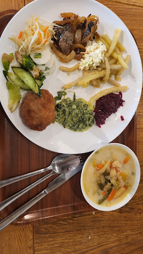 Read moreJedna gwiazdka dodatkowo na zachętę. Jedzenie jest różne, zależy czego się sprobuje. Bardzo dobre kotlety mielone, szpinak, surówki, sałatki, watrobka. Fasolka szparagowa - za mało świeżej bułki i jest rozgotowana, zero chrupkości i twardości. Zupa niestety to slaby punkt tej restauracji. Warzywa kompletnie rozgotowane, zupa nie na smaku, jest też niedoprawiona. O 13 obsługiwała nas pani na kasie której mina jest taka, że człowiek boi się podejść, niezadowolona ze klient się pojawił. Prawie nic się nie odzywa, zero uśmiechu. To jedyny ludzki kontakt klienta z pracownikiem tej restauracji i wypada on bardzo negatywnie. Ogólnie dużo dobrych dań na szybki obiad, ale są rzeczy do szybkiej poprawy... Ładne wnętrze i klimat, piękne...