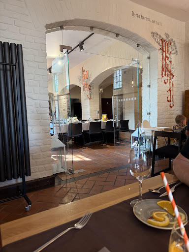 The restaurant is in an excellent location, right next to the Teutonic castle ruins, it is in a lovely building and has a running canal right under it. Interiors are very cosy, though the lights could be easily turned down by half at least, it would be way more ambient, especially with the beautiful Christmas decorations they have there, not to mention save on electricity. There was at least 4 staff on the floor, and not so many customers, maybe only 3 tables at any given time, yet service, though friendly enough, was not very attentive. Plates were not cleared for a long time, so much so that the waiter had to remove my starter plate some 15-20 minutes after I finished it so he could put down my main plate in its place! Noone inquired about the food, offered another drink or shown that much interest in the customers that were there. Staff disappeared into the kitchen or side room and didn't really come out that much. The beetroot broth starter was very good, the main of the duck disappointing. Meat wasn't rested properly, so it bled all over the plate within minutes (see photos), duck was on the overdone side, definitely less the promised pink, more well done, only slightly pink in the middle, end bits so well done and too chewy, not nice to eat. Orange sauce with the duck was very good, and crumb over potatoes - a nice touch, lovely presentation, just such a shame about the meat. Try the Polish red they recommend if you are going by the glass, I can't recall the name, as despite numerous promises to do so, the staff failed to write it down in the end. Though they offered to take my coat, and did, they failed to bring it when I asked for it after paying, I had to go look for it, they hanged it, as it happened, in another hall of the restaurant. Guess that's what I mean by lack of attention, these little things, especially when restaurant is practically empty with max 12 people in it, and 4 waiters. Overall, good but not outstanding by any means, at least not tonight. It was a Saturday night, weekend before Christmas, perhaps usual chef wasn't in. I was expecting more from the food, judging from food photos posted by other diners. Perhaps it was just...