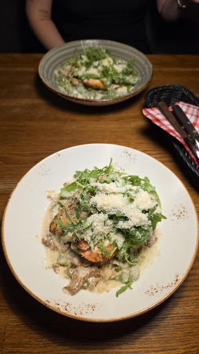 Read morebyłem w restauracji i jadłem na przystawkę zupę grzybową i tatara z łososia z menu sezonowego, zupa była pyszna, moim zdaniem najbardziej udane danie ze wszystkich, które jadłem. tatar z łososia był smaczny, ale wymagał dużej ilości przypraw, początkowo pomyślałem, że to dlatego, że to tatar, ale później okazało się, że inne dania również tego potrzebują. mimo tego, przystawki skończyłem zadowolony. następnie zjadłem rigatoni z kurkami i kurczakiem. zapiekany makaron był mocno średni, suchy kurczak, sos śmietanowo-serowy nie był wystarczająco aromatyczny, ogólnie daniu brakowało przypraw. dopiero po przyprawieniu solą, pieprzem i oliwą czosnkową danie nabrało smaku. na deser skonsumowałem sernik sam sebastian z ciastkami korzennymi. danie poprawne, dokładnie takie jak można sobie wyobrazić, lecz bez efektu wow. podsumowując część jedzeniową - mogło być lepiej, lecz jestem zadowolony. przechodząc do obsługi, pani była miła, lecz bardzo „kelnerska”, niczego co wychodziło by poza etykietę nie doświadczyłem. jest to neutralne zachowanie, jednym pasuje bardziej, innym mniej, ja preferowałbym bardziej „ludzki” kontakt z klientem. niemniej nie jest to duży minus. jeśli chodzi o atmosferę - restauracja ma bardzo ładny wystrój, wszystko do siebie pasuje. stoły są duże, więc jest wygodnie. no i myślę, że perełką atmosfery jest bardzo ładnie zrobione menu składające się z kart dań, drinków i produktów sezonowych. jest to po prostu ładne i cieszy oko. atmosfera przyjemna. podsumowując - raczej pozytywne doświadczenie kulinarne, pozytywne doświadczenie jeśli chodzi o spędzony czas. myślę, żeby tu wrócić. ps: jestem wysoki i nisko zawieszone lampy, troszkę...