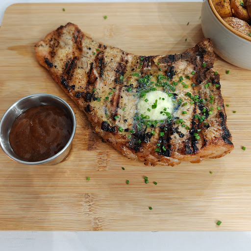 Schab z kością: Miękkie i soczyste mięso, doprawione do perfekcji. Podawane z pysznymi dodatkami do wyboru z menu ( pure z pastą truflową i marchewka po koreańsku robią robotę )