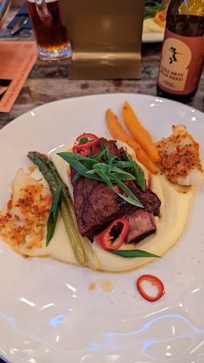 Food and drink: ++ What makes this location special is that they brew the beer on site and it is really good! The caramelized beef ribs were delicious