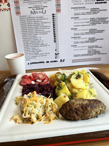 Read moreLokal jest bardzo ciasny (8 miejsc na antresoli + ok. 4 miejsca przy wejściu). Z racji niewielkiej przestrzeni panuje wewnątrz spory zaduch. Po wizycie zapach kapusty dość długo gości na ubraniu. Krzesła składane, ogrodowe. Na jednorazowych talerzach serwowane są tutaj dania kuchni ukraińskiej (i z pogranicza polskiej). Za około 17 zł zjemy tutaj drugie danie. Jadłem tutaj gulasz z kopytkami, głąbki i filet rybny w panierce. Ziemniaki były bardzo dobre, surówki świeże, ryba zdecydowanie odgrzewana (sądząc po panierce), gulasz dobry, aczkolwiek za dużo to go nie było. Dania mają charakter domowy, są smaczne i sprawiają...