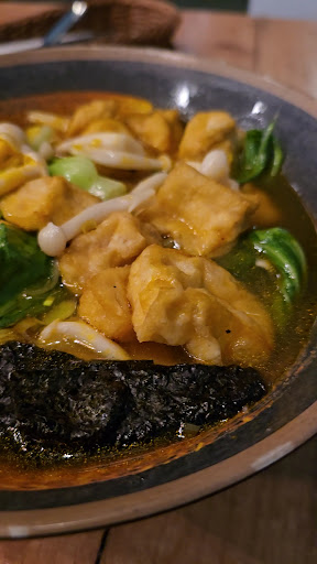 Best vegan food in Warsaw hands down. Giant menu of Vietnamese, Korean, Thai, Malaysian, Japanese, Chinese and eastern inspired dishes. We've tried loads over the past few weeks and solid favourites are Udon Noodles - a very generous portion served with 2 breaded tofu croquettes, Laksa & ramen - both super flavoursome and served with seitan style meat replacements that were approved even by our meat eating guests. We also had a selection of small bowls from the menu - starters if you like -'Chicken' style power balls - 4 breaded chicken style balls with sweet chilli sauce were yummy. Spring rolls with pineapple were gigantic but quite frankly lacked some flavour but were luckily served with 2 sauces including a peanut one. Tofu and oyster mushroom bulgogi were delicious - my personal favourite. And so was mango salad and stewed pumpkin and mushrooms side dish. We also had delicious homemade lemonade. Service was attentive and very patient with our large and chaotic group. It's always the place we visit when we're in Warsaw. A true gem!
