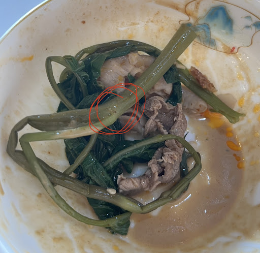 Read moreThere’s a worm on the vegetable, and it’s been cooked in the stock, which means the whole similar cuisine has been cooked in this broth that boiled the worm at the day. Clearly they don’t wash the vegetables that much clean. Who knows how many worms and bugs have been cooked all in those cuisines and existing in the kitchen everyday....