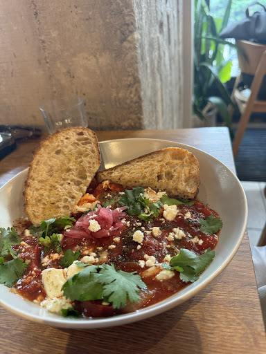 Good music, well cooked eggs in shakshuka, busy atmosphere.