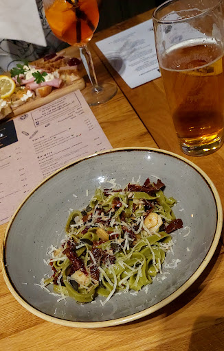 Read moreByliśmy grupą 16 osób i zaczęło się dobrze. Dwóch kelnerów zbierało zamówienia po każdej ze stron stołu i na tym skończyły się plusy. Kelnerka narzuciła kolejność zamawiania jak w przedszkolu, czas oczekiwania na same napoje to jakieś 20-30 minut. Przynosili po jednym lub dwóch napojach w jakieś dziwnej konfiguracji. Z podawaniem dań było podobie, jedna zupa została wydana i długo nic. Smak jedzenia to rzecz gustu ale krewetki bez czosnku i z koperkiem a nie natką pietruszki to trochę żart. Makarony całkiem dobre, burgery zjadliwe Żeberka wymagały poświęcenia aby pozbyć się kości. Ale po tym to apokalipsa. Kelnerzy zabrali talerze i puste szklanki i już nikt nie zapytał czy coś podać? O piwo trzeba było się doprosić bo kelnerka nie patrzyła wogole na nas a kelnera już nie było. Podkreślam że lokal był pusty, jedynie pojedyncze pary. Ten lokal nie jest nastawiony na gości, chyba tylko śniadanka dla gości hotelowych. Przykro bo mogliśmy ich hojnie...
