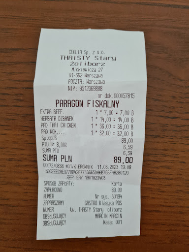 Read moreDo restauracji idziemy po to, by smacznie zjeść, spędzić czas w miłej atmosferze i w sympatycznym towarzystwie. W Thaisty na Żoliborzu, poza tym ostatnim z wymienionych, nie doświadczyłam tego. Lokal nie jest mały, natomiast rozmieszczenie stolików uniemożliwia swobodną rozmowę. Stoliki są na tyle blisko siebie, że słyszy się rozmowy innych tak, jakby się w nich uczestniczyło. Muzyka odpowiedniej głośności, szkoda tylko, że wybór repertuaru daleko odbiegający od tajskich dźwięków- lubię, gdy restauracja "trzyma temat" w każdym aspekcie. Na jedzenie czekaliśmy ok. 20 min. Natomiast w międzyczasie kelner dwukrotnie podchodził i upewniał się co dokładnie zamówiliśmy. Jeśli chodzi o jedzenie, to ogromne rozczarowanie. Zamówione pad phak tofu (w sosie ostrygowym), to totalnie nieporozumienie smakowe. Z pewnością nie było tam czuć Tajlandii. Poza zepsutym tofu, który nadawało "smak" daniu, to totalna nijakość. Ani ostre, ani słone, ani słodkie. Nijakie. Duża porcja. Ryż jaśminowy na jedzenie pałeczkami niewystarczająco klejący. Kolejne danie, to phad tai z kurczakiem. Duża porcja...makaronu. niewielka ilość sosu, kurczaka i tofu (tu dobrego). A do tego ogromna ilość chilii rzuconego na orzeszki. Jeśli chilii i orzeszki są podane obok dania, to znaczy, że uznaniowo można je dorzucić do dania. Tu przyjęto opcję- albo garść chilii z orzeszkami, albo w ogóle. Danie podane bardzo nieestetycznie i nieapetycznie. Jest to jedna z gorszych restauracji tajskich, w jakich byłam. Z pewnością nie dorównuje Thaisty z Placu Bankowego. Szyld ten sam, ale jakość nieporównywalnie gorsza. Ponadto byliśmy świadkiami nieuprzejmego potraktowania starszej klientki przez kelnera. Pani zajęła miejsce przy stoliku, który był nieposprzątany. Tłumaczyła to tym, że się słabo poczuła i nie mogła dłużej stać. Nie wnikając jednak w powody, dla których to zrobiła, kelner potraktował ją arogancko, wręcz chamsko. Ton i sposób jego komunikatów z pewnością odbiegały od zasad grzecznościowych. Zważywszy na fakt, iż była to pani po 70, to w mojej świadomości nie mieści się taki brak szacunku do starszych osób. Na tę kłótnię nadszedł kolejny kelner, który ze spokojem wyjaśnił pani zasady obowiązujące w restauracji, sprzątnął stolik i przyjął zamówienie. Myślę, że niewychowany kelner mógłby nabrać trochę ogłady ucząc się od swojego kolegi po fachu. Thaisty na Żoliborzu, to miejsce, w którym nie znalazłam ani dobrego jedzenia, ani przyjaznej atmosfery, która przecież jest tak charakterystyczna dla tajskiego...
