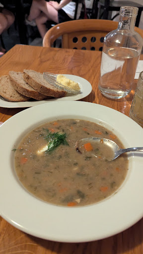 We dined at the restaurant late June with international friends visiting Poland (some of them for the very first time) and the Eatery seemed like a perfect place to introduce them to Polish cuisine in a high quality execution. We got out of there really surprised and I will try to give a review as objective as possible, of both good and bad experiences we had. My first impression was great when booking and checking possibilities for a 12ppl group. The person I spoke to was very informative and offered to send a special groups menu in advance. A few days passed and I havent received the email, so I called to ask for it again - it got lost somehow, which happens ofc. After my second call I still havent received the special offers until midnight of the night before our visit. And if we were interested I had to confirm that before 1pm the next day which was a pretty narrow window of just few hours. But we ended preferring a la carte anyways, so all good. Upon arriving a waitress with a stone cold face would come, stand at the top of the table wanting us to dictate the order and being very disappointed when asked questions. And questions were necessary since the menu didn’t tell much. A typical small-plate-restaurant A5 card with minimal explanation, tiny typography. An enigmatic menu is fine if accompanied by a well-informed waiter ready to tell some more about the dishes. Our waitress when asked „what is wuzetka” rolled her eyes and said „its basically a chocolate cake” which is the saddest way to describe this Warsaw confectionery classic. If we were at a Bar Mleczny I wouldn’t be surprised for the service being irritated when asked about the food. But for a restaurant doing traditional cuisine and often hosting international guests I would have expected a bit more than nothing. When I ordered a Kompot she grimaced and said she would not recommend it today. Interesting, I will give her points for honesty! Each position on the menu had two mysterious numbers. We asked if those were starter- vs main- sizing prices. She goes „Umm yea it depends per dish. For some stuff the big price will be 4ppl portion, for sth else a 2ppl.” Which is a hardly helpful answer and silliest way to construct a menu. Despite the fact that we were 12 ppl seated at a long table, our waitress refused to move from her spot at the top of it to hear the orders of ppl from the other end - so we had to shout our orders along the several-meter-long table to make sure she hears us well. Very bizarre. It costed us some hard work but we managed to place the orders. The food came with few small mistakes which would have been completely avoidable were our waitress a tiny bit attentive. But she didn't say much and we could only hope she got our orders right. Food. Delicious, well done. The Gołąbki were probably the best I’ve ever had, Kaszanka was incredible, Chłodnik was very good. Kluski śląskie came bare, without any sauce or the traiditional bacon bits „zasmażka” which was strange. I am guessing thats because they were just a side dish, which I am again just guessing based on the layout of the menu that lacked any titles/categories whatsoever. Nevertheless everyone was very satisfied, with their food, we got a great tasting of the cuisine and the dishes is what we would come back for.