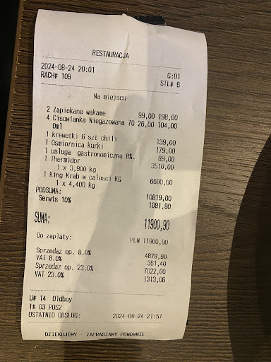 This place is an absolute scam! They served us seafood without informing us about the weight of the seafood . They intentionally hide the weight details and after we finished eating, we were hit with an outrageous bill of 11,900.90 PLN.
