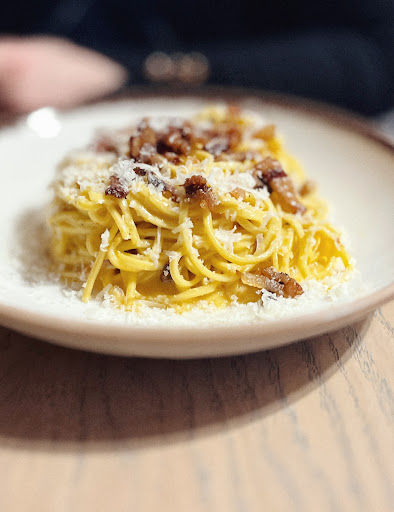 Pasta is a wonderful type of dish but as such, you have to do your best to respect the tradition. You can't make aglio e olio with butter (aglio e olio means garlic and oil), an arrabiata with pesto (arrabiata is a spicy sauce), or a carbonara with cream (that is an absolute no-go for Italians). But even if you decide to go for the real carbonara dish that they have, they had it nearly right... except that the cheese they had to use was pecorino and not grana padano