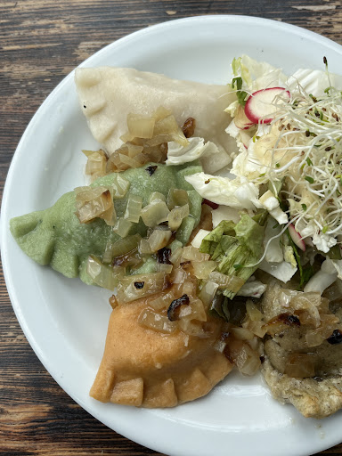 I don't even know where to start. I saw a listing in a tourist booklet on Warsaw and this was listed as having vegan as well as gluten free food. I'm vegetarian and eat vegan whenever it's an option; my mother has to eat gluten free. Seeing a place that catered to both was an easy decision. We arrived around 1 and it was pretty crowded. Luckily, most of the people were getting their food to go, so we were able to find a table. There were tables both inside and out, but it was slightly on the small side.