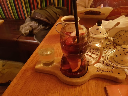Read morePrzyszliśmy do zapiecka po kilku miesiącach przerwy i jednogłośnie uznaliśmy, że wiele się tutaj zmieniło, niestety na niekorzyść. Na start przyniesiono nam zupę, której nie zamawialiśmy. Pomyśleliśmy okej, zdarza się pomyłka, sporo klientów, wybaczamy. Kolejno dostaliśmy krokiety( sam smak niby w porządku ale smażenie we fryturze? W restauracji, która od wejścia powinna kojarzyć się z polską, tradycyjną kuchnią? Tragedia). Zamówiliśmy także kompot z suszu( kompletnie bez smaku i rozwodniony), oraz pierogi. Zamówiłam pierogi z mięsem 9szt i dodatkowo 1 ruski. Moje zamówienie przyszło jak najbardziej w porządku, za to mąż otrzymał porcję 7 pierogów mimo, że w karcie widnieje informacja 9 sztuk, co potwierdził u kelnerki przy składaniu zamówienia. Wyjaśnienie kelnerki? Wymieniono jednego pieroga z owocami na ruskiego, czyli innymi słowy jednego pieroga zabrali mężowi, żeby dać mi, ponieważ w innym przypadku zapłacilibyśmy większy rachunek. Świadomie domówiłam jedną sztukę dodatkowo, żeby spróbować, a mąż świadomie upewniał się, że pierogów z owocami będzie 9. Nikt nie poinformował nas o takiej zamianie nawet, jeśli powodem były dobre chęci, to wolelibyśmy sami o tym zadecydować, ile chcemy zapłacić i ile zjeść. Pierogi z owocami kiepskie, do zjedzenia jedynie te z porzeczką, z truskawkami - wygotowana breja, a to wszystko podane z „sosem waniliowym”. Zapamiętaliśmy smak tego sosu jako pyszny z poprzednich wizyt, jednak to, co otrzymaliśmy, to żaden sos, to po prostu budyń z bardzo sztucznym waniliowym aromatem- okropne. Wielka szkoda bo ten dodatek kiedyś był naprawdę pyszny. Do moich pierogów zamówiłam surówkę z marchewki i jabłkami ale powiedziałabym, że ta surówka, to raczej jabłko z jabłkiem starte na grubych oczkach i to by było na tyle. Zero przypraw, po prostu suchy produkt. Podsumowując nasze zamówienie- Jedyne, co moglibyśmy określić mianem smaczne, to pierogi z mięsem. Kolejna rzecz, która zwróciła naszą uwagę, to zachowanie personelu. Kłótnie między kelnerami, pretensje i niezadowolenie było słychać z daleka przy stolikach. To samo komentarze dotyczące klientów. Siekierę wiszącą w powietrzu było czuć już od wejścia. Zdaje się, że kelnerzy pracują w tym miejscu za karę. Komentarze między sobą słyszane przez gości, to naprawdę niedopuszczalna sytuacja i brak kultury! Zdecydowanie nie polecimy już więcej tego miejsca bo czasu spędzonego tam naprawdę nie można określić jako przyjemnego. Mimo, że jednego pieroga z owocami doniesiono, a pseudo sos został odliczony od rachunku, cała wizyta była raczej mało przyjemnym doświadczeniem. Zarówno od strony kulinarnej, jak i obsługi oraz samego klimatu panującego w...
