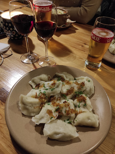 Read morewe invited international group of partners we work with to dinner to taste Polish cuisine; we ordered a selection of pierogi for everyone to try; on top of that everyone ordered what they wanted; pierogi were brought in wooden plates/containers like in the old days which was fine but they were lukewarm and falling apart; they looked as if someone has overcooked them and then just poured them into the plates; they were with a variety of stuffing - spinage was the worst, meat ones were not tasty at all, Ruskie were without any taste; I have not tried any other, supposedly the ones with the pinkish dough were horrible.; I also orgered goose liver - it was really overcooked, so hard and tasteless I do not even know if it was goose liver; it was served on a piece of bread that was fried so everything was pouring with fat. Meat dishes that our guest ordered were fine, some even good (gołąbki - stuffed cabbage, and some pork dishes). The service is very nice but waiting time for food is very long. PS the waitress exchanged our pierogi for hot ones when I compleined, but the shape (or lack of it) and the taste has not changed. The place has a very good location so it is a shame they do not pay attention to the quality...