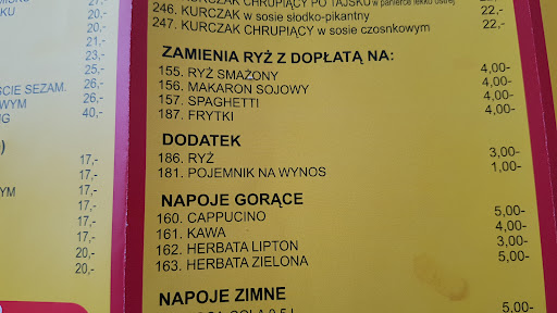 Miałem ochotę na coś pikantnego. Wybrałem chińczyka niedaleko rynku we Wrocławiu który opisuje. Wszedłem na stronę, zobaczylem menu podane jako zdjecia na stronie. Szedlem z myślą wydania 19 zl na chrupiącą kaczkę. Gdy już byłem na miejscu okazało się że to jakies wcześniejsze zdjęcia a ceny różnią sie nie o złotówkę tylko wiecej. W zasadzie cale menu zostalo napisane od nowa z nowymi cenami jak i zmianani np. W dodatkach. Za wspomnianą wcześniej kaczkę zapłaciłem 25 zł. Dodatkowo gdy dałem 105 zl dla lepszego wydania reszty w banknotach to dostałem 75 zl z moja 5-tką 😁 musiałem się troszkę upomnieć, Pani nie była zbytnio zadowolona jakbym ją chciał oszukać ale ostatecznie po kilku wymianach zdań po chińsku z Panem z tylu udalo mi sie otrzymać 80 zl reszty 😀 Jednak ta sytuacja nie wpłynęła na moja ogólną ocene 3 gwiazdek, gdyż każdy się może pomylić - czyż nie ? 😃 Otrzymalem kaczkę dość szybko bo chyba po 6-8 minutach także na plus czas oczekiwania na jedzenie. Porcja mięsa również na plus, da się w tym lokalu naprawdę dobrze zjeść. Sosy sa na stolikach - łagodny i ostry. Kaczka chrupiąca też smakowala nieźle. . Jeśli chodzi o minusy. To niestety te nowe podniesione dość mocno ceny. Szczególnie biorąc pod uwagę wciąż widniejące na google stare zdjęcia z cenami. Moim zdaniem również za mała porcja ryżu i surówki do danej porcji mięsa jak również przy tych podniesionych nowych cenach. Domawiając surówkę, KTÓREJ Z RESZTĄ NIE MA w KARCIE zapłaciłem wzięta przez Panią obsługująca cenę z głowy bo aż 4 zl. Moim zdaniem cena dość wysoka biorąc pod uwagę inne ceny z karty i też to że zawsze jak płaciłem w tego typu restauracjach za dodatkowy ryż badz surówkę płaciłem za porcję 1zl czasem 2 zł maksymalnie 3-4 zł ale w bardziej jakby to powiedziec ekskluzywnych barach azjatyckich 😀 Wstawiam nowe zdjęcia menu z nowymi już cenami. Jak również zdjęcie dodatków na którym nie ma wspomnianej wcześniej surówki, więc teoretycznie powinienem dostać jej dokładkę...