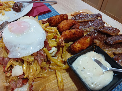 Read moreAtendimento agradável, senhoras muito simpáticas. O espaço era bonito, o ambiente era só um pouco estranho por ter 2 televisões em que passava o preço certo numa e uma novela na outra com som bastante audível. Pedimos pão de alho de entradas, que estava bom. Como prato principal, a tábua de picanha, camarão panado e ovos rotos, que estava boa mas com bastante gordura em tudo, o que foi indegesto durante algumas horas. De sobremesa, natas do céu que têm demasiadas natas e não recomendo. Provei o vinho branco maduro da casa, é alentejano e agradável. De uma maneira geral foi uma boa...