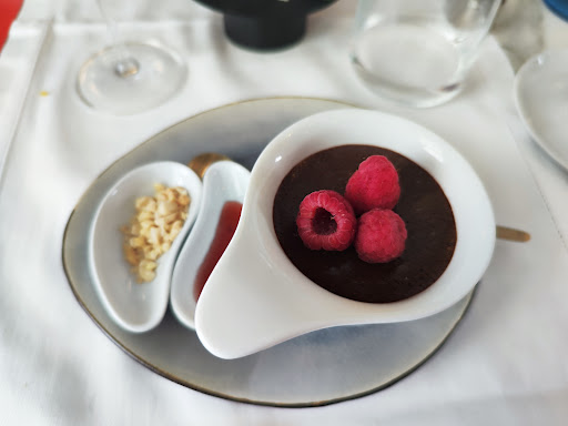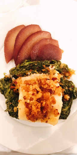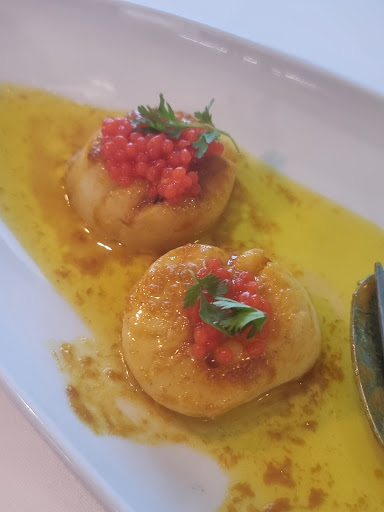 Read morePartilhei um Bacalhau com crosta de presunto, cremoso de espinafres e pêra bêbada, seguido de um Tiras de lombo de mertolenga salteadas em caramelo e soja, acompanhados de batata chip. Terminámos com Sopa Dourada. A comida é simplesmente incrível, tudo no ponto. O staff é muito atencioso, sempre a esclarecer tudo. Bebemos uma sangria tinta soberba, com notas de 'Natal' - canela, doce, um toque da café. Foi tudo mesmo incrível. O espaço é pequeno, de passagem num hall do hotel, mas vale mesmo a pena. O estacionamento é chato, muita zona de residentes à volta, mas tem uma rua a subir antes da rotunda, com alguns lugares normais. O restaurante encontra-se no Hotel Moura, em frente a uma fonte, foi um problema dar com ele por não ter qualquer nome identificativo do restaurante em...