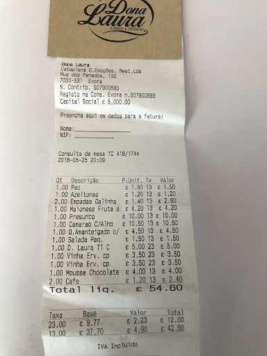 Read moreMy experience at Dona Laura was great! The food was very good, and the prices were extremely reasonable. I highly recommend getting the garlic shrimp and pepper steak. For dessert, the passion fruit mousse was delicious. The staff at the restaurant were very kind and helpful. Originally, we had a reservation for a previous day, but because of train strikes, we were unable to make the trip to Evora. However, we went three days later and were able to get a table when the restaurant opened without a reservation. Definitely eat here if you are making the...