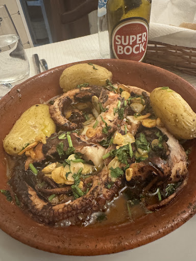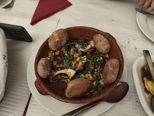 The total bill for two dishes, water and bread was 25 euros. Familiar setting. Kids friendly. We were served by Father and Son (we think). Service slightly slow, but not as slow as others complain. They were attentive and nice. The "Polvo as Lagareiro" was served in olive oil from a previously dish of Bacalhau, it killed the dish. The Bacalhau À Braz seemed made previously, frozen, and defrozen, the taste was a bit off. Given that both dishes were ruined, we won't...