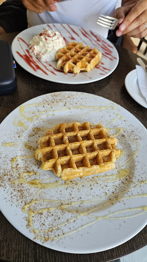 Gran variedad Fuimos mi pareja y yo a cenar (bastante pronto), hoy lunes. Atención: la señorita que nos atendió, muy amable. La carta: una gran variedad de cosas para comer, es una cafetería, no un restaurante, pero tiene varias opciones. Dulces (bizcocho, muffins, helados, batidos, wafles, entre otros). También salados (wraps, ensaladas, hamburguesas). Sabor: mi novio se pidió una hamburguesa mixta, dijo que estaba muy bien, buen tamaño para el precio . Yo me pedí una ensalada jardim (bastante buena, y grande, con queso mozarella, piña, jamón). Además nos tomamos un bizcocho (sabor bueno y tamaño grande) y una bola de helado de vainilla. Precio: estupendo. Todo nos salió por 13 euros (incluido las bebidas). Relación calidad - precio: fenomenal. El lugar: bastante sencillo, la decoración no es gran cosa, pero para tomar algo está muy bien.Tiene terraza con varias mesas. En resumen:...