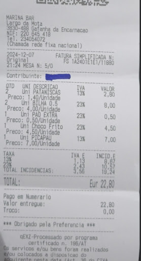 Read moreDepois de desgostar boas pataniscas de bacalhau anteriormente, desta vez foi péssimo, desgostei pataniscas de farinha muito passadas e salgadas, foram devolvidas, pedi um picapau que foi devolvido PK estava intragável, tbm pedi choco frito que era industrializado mas estava razoável. Lamentavelmente não voltarei ao marina bar, SÓ não dou 0 estrelas PK não é possível....