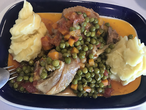 The food was served. I asked the fish dish, 3 fish fillet were served with vegetables rice. My wife asked for the veal and 3 small steaks came with punched patoes and a mix of corn bread with cabbage and pickles, very nice mixture 😁.